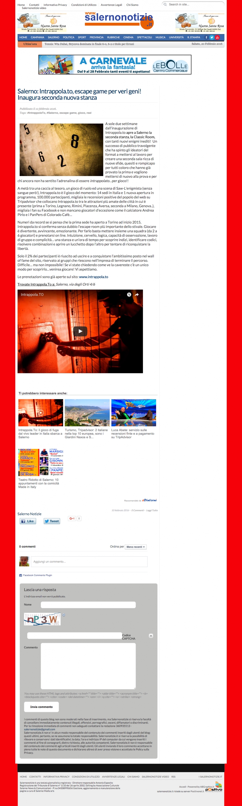 A sole due settimane dall’inaugurazione di Intrappola.to apre a Salerno la seconda stanza, la Classic Room, con tanti nuovi enigmi inediti! Un successo di pubblico travolgente che ha spinto gli ideatori del format a mettersi al lavoro per creare una seconda sala ricca di nuove sfide, quesiti e rompicapo per tutti coloro che hanno già provato la prima e vogliono mettersi di nuovo alla prova e per chi ancora non ha sentito l’adrenalina di essere intrappolato…per gioco!! A metà tra una caccia al tesoro, un gioco di ruolo ed una scena di Saw-L’enigmista (senza sangue però!), Intrappola.to è il gioco del momento: 14 sedi in Italia e 1 nuova apertura in programma, 100.000 partecipanti, migliaia le recensioni positive del popolo del web su Tripadvisor che collocano Intrappola.to tra le attrazioni più amate delle città in cui è presente (prima a Torino, Legnano, Rimini, Piacenza, Aversa, seconda a Milano, Genova..), migliaia i fan su Facebook e non mancano giocatori d’eccezione come il calciatore Andrea Pirlo e i PanPers di Colorado Cafè… Numeri da record se si pensa che la prima sede ha aperto a Torino ad inizio 2015, Intrappola.to si conferma senza dubbio l’escape room più importante dello stivale. Giocare è divertente, avvincente, emozionante. Per farlo basta mettere insieme una squadra (da 2 a 6 giocatori) e prenotarsi on line. Intuizione, cervello, logica, capacità di osservazione, lavoro di gruppo e complicità… una stanza e un’ora di tempo per scoprire indizi, identificare c