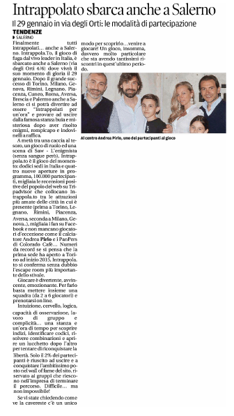 SALERNO. Finalmente tutti intrappolati… anche a Salerno. Intrappola.To, il gioco di fuga dal vivo leader in Italia, è sbarcato anche a Salerno (via degli Orti 4/6) dove vivrà il suo momento di gloria il 29 gennaio. Dopo il grande successo di Torino, Milano, Genova, Rimini, Legnano, Piacenza, Cuneo, Roma, Aversa, Brescia e Palermo anche a Salerno ci si potrà divertire ad essere “Intrappolati per un’ora” e provare ad uscire dalla famosa stanza buia e misteriosa dopo aver risolto enigmi, rompicapo e indovinelli a raffica. A metà tra una caccia al tesoro, un gioco di ruolo ed una scena di Saw - L’enigmista (senza sangue però), Intrappola.to è il gioco del momento: dodici sedi in Italia e quattro nuove aperture in programma, 100.000 partecipanti, migliaia le recensioni positive del popolo del web su Tripadvisor che collocano Intrappola.to tra le attrazioni più amate delle città in cui è presente (prima a Torino, Legnano, Rimini, Piacenza, Aversa, seconda a Milano, Genova..), migliaia i fan su Facebook e non mancano giocatori d’eccezione come il calciatore Andrea Pirlo e i PanPers di Colorado Cafè… Numeri da record se si pensa che la prima sede ha aperto a Torino ad inizio 2015, Intrappola.to si conferma senza dubbio l’escape room più importante dello stivale. Giocare è divertente, avvincente, emozionante. Per farlo basta mettere insieme una squadra (da 2 a 6 giocatori) e prenotarsi on line. Intuizione, cervello, logica, capacità di osservazione, lavoro di gruppo e complicità… una