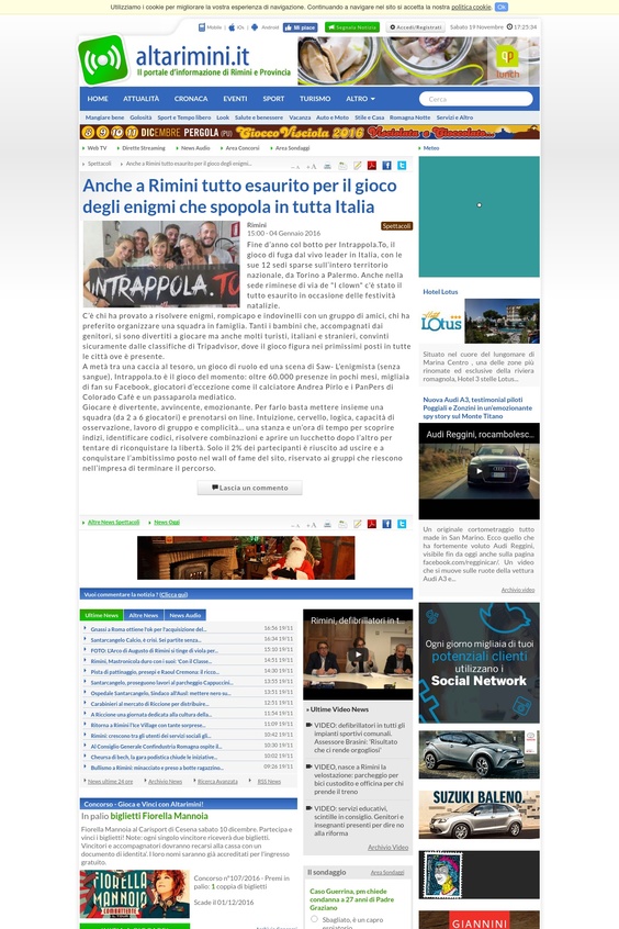 Fine d’anno col botto per Intrappola.To, il gioco di fuga dal vivo leader in Italia, con le sue 12 sedi sparse sull’intero territorio nazionale, da Torino a Palermo. Anche nella sede riminese di via de "I clown" c'è stato il tutto esaurito in occasione delle festività natalizie. C’è chi ha provato a risolvere enigmi, rompicapo e indovinelli con un gruppo di amici, chi ha preferito organizzare una squadra in famiglia. Tanti i bambini che, accompagnati dai genitori, si sono divertiti a giocare ma anche molti turisti, italiani e stranieri, convinti sicuramente dalle classifiche di Tripadvisor, dove il gioco figura nei primissimi posti in tutte le città ove è presente. A metà tra una caccia al tesoro, un gioco di ruolo ed una scena di Saw- L’enigmista (senza sangue), Intrappola.to è il gioco del momento: oltre 60.000 presenze in pochi mesi, migliaia di fan su Facebook, giocatori d’eccezione come il calciatore Andrea Pirlo e i PanPers di Colorado Cafè e un passaparola mediatico. Giocare è divertente, avvincente, emozionante. Per farlo basta mettere insieme una squadra (da 2 a 6 giocatori) e prenotarsi on line. Intuizione, cervello, logica, capacità di osservazione, lavoro di gruppo e complicità… una stanza e un’ora di tempo per scoprire indizi, identificare codici, risolvere combinazioni e aprire un lucchetto dopo l’altro per tentare di riconquistare la libertà. Solo il 2% dei partecipanti è riuscito ad uscire e a conquistare l’ambitissimo posto nel wall of fame de