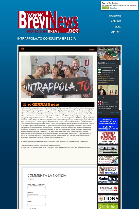Finalmente tutti intrappolati… anche a Brescia! Intrappola.To, il gioco di fuga dal vivo leader in Italia, è sbarcato anche nella provincia lombarda e inaugurerà il 23 gennaio 2016! Dopo il grande successo di Torino, Milano, Genova, Rimini, Legnano, Piacenza, Cuneo, Roma, Aversa e Palermo anche a Brescia ci si potrà divertire ad essere “Intrappolati per un’ora” e provare ad uscire dalla famosa stanza buia e misteriosa dopo aver risolto enigmi, rompicapo e indovinelli a raffica. A metà tra una caccia al tesoro, un gioco di ruolo ed una scena di Saw- L’enigmista (senza sangue però!), Intrappola.to è il gioco del momento: 12 sedi in Italia e 4 nuove aperture in programma, 100.000 partecipanti, migliaia le recensioni positive del popolo del web su Tripadvisor che collocano Intrappola.to tra le attrazioni più amate delle città in cui è presente (prima a Torino, Legnano, Rimini, Piacenza, Aversa, seconda a Milano, Genova..), migliaia i fan su Facebook e non mancano giocatori d’eccezione come il calciatore Andrea Pirlo e i PanPers di Colorado Cafè… Numeri da record se si pensa che la prima sede ha aperto a Torino ad inizio 2015, Intrappola.to si conferma senza dubbio l’escape room più importante dello stivale. Giocare è divertente, avvincente, emozionante. Per farlo basta mettere insieme una squadra (da 2 a 6 giocatori) e prenotarsi on line. Intuizione, cervello, logica, capacità di osservazione, lavoro di gruppo e complicità… una stanza e un’ora di tempo per scoprire indizi, identi