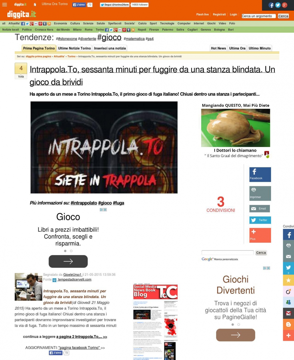 A Torino il primo gioco di fuga italiano. Prigionieri dentro una cella e con sessanta minuti a disposizione per liberarsi, la chiave della libertà è l’ingegno. Si chiama Intrappola.TO e nasce sul modello straniero delle Escape Room. I partecipanti vengono imprigionati dentro una stanza dalla quale potranno uscire solamente scoprendo indizi, identificando codici, risolvendo combinazioni e aprendo una serie non precisata di lucchetti. Adrenalina, intuizione e cervello sono gli ingredienti che fanno di questo gioco un’esperienza indubbiamente curiosa da affrontare. Al momento Intrappola.TO è presente a Torino, zona San Salvario, e Milano, le prime due stanze hanno aperto da un mese a Torino e in poche settimane sono schizzate in cima alle attrazioni più richieste ed apprezzate della città. A maggio ha aperto la sede di Milano, sono già in programma le aperture di Genova e Roma. I giocatori sono soli sin dal loro arrivo. La porta di ingresso è anonima, niente reception né accoglienza, solo un codice di ingresso inviato via mail dopo l’iscrizione on line. Possono giocare tutti, bambini da 6 anni a adulti da 99 anni. Le squadre possono essere composte da un minimo di due elementi a un massimo di sei. Per iscriversi a Intrappola.TO basta compilare il form on line su www.intrappola.to. Il costo per ogni sessione di gioco è di € 60 a squadra ed è possibile iscriversi per giocare in una stanza oppure, per gruppi più numerosi, in due contemporaneamente, per sfide sempre più compless