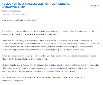 Avete impegni per la notte di Halloween? Se amate il mistero e gli enigmi, che siate in famiglia o con gli amici, il posto giusto dove festeggiare la notte più mostruosa dell’anno è sicuramente la terribile cella di Intrappola.to! La squadra (da due a sei giocatori) si ritrova chiusa in una stanza, buia e misteriosa, e ha un’ora di tempo per scoprire indizi, identificare codici, risolvere combinazioni e aprire un lucchetto dopo l’altro per tentare di riconquistare la libertà. Il gioco, tutto adrenalina, intuizione e cervello, consiste nell’entrare e, accompagnati dall’inesorabile scorrere del tempo, concentrarsi per risolvere una serie di enigmi e quesiti di logica e osservazione. A metà tra una caccia al tesoro, un gioco di ruolo dal vivo ed una scena di Saw- L’enigmista (senza sangue però!), Intrappola.TO è il gioco di fuga più famoso dello stivale. 25 stanze in Italia, una in Spagna ed altre 10 in apertura in Italia e all’estero, più di 250.000 giocatori in un anno, oltre 150.000 followers su Facebook, la conquista dei primi posti nella classifica di Tripadvisor in tutte le città in cui è aperto. Intrappola.to è un’esperienza coinvolgente, inquietante, divertente… da provare! E per avere una foto ricordo indimenticabile della squadra di Halloween preparate costume e trucco mostruosamente originali!