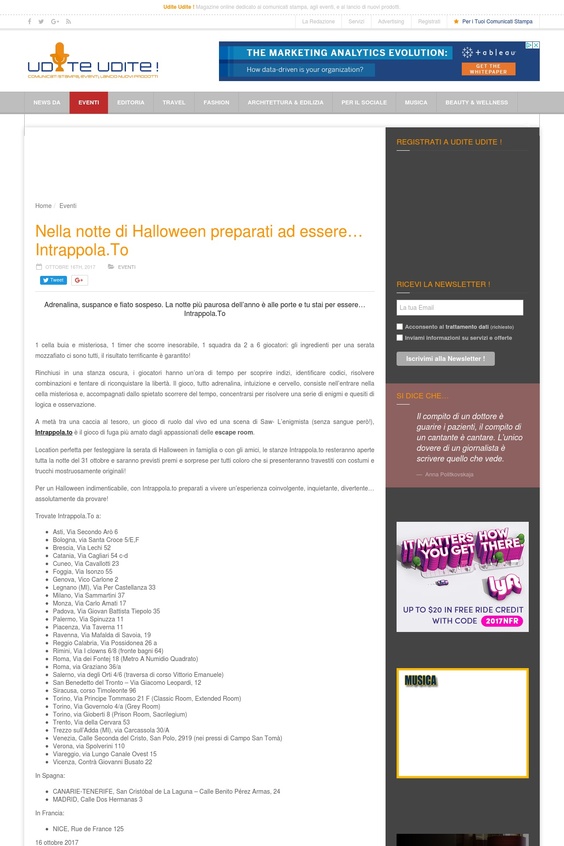 Adrenalina, suspance e fiato sospeso. La notte più paurosa dell’anno è alle porte e tu stai per essere… Intrappola.To 1 cella buia e misteriosa, 1 timer che scorre inesorabile, 1 squadra da 2 a 6 giocatori: gli ingredienti per una serata mozzafiato ci sono tutti, il risultato terrificante è garantito! Rinchiusi in una stanza oscura, i giocatori hanno un’ora di tempo per scoprire indizi, identificare codici, risolvere combinazioni e tentare di riconquistare la libertà. Il gioco, tutto adrenalina, intuizione e cervello, consiste nell’entrare nella cella misteriosa e, accompagnati dallo spietato scorrere del tempo, concentrarsi per risolvere una serie di enigmi e quesiti di logica e osservazione. A metà tra una caccia al tesoro, un gioco di ruolo dal vivo ed una scena di Saw- L’enigmista (senza sangue però!), Intrappola.to è il gioco di fuga più amato dagli appassionati delle escape room. Location perfetta per festeggiare la serata di Halloween in famiglia o con gli amici, le stanze Intrappola.to resteranno aperte tutta la notte del 31 ottobre e saranno previsti premi e sorprese per tutti coloro che si presenteranno travestiti con costumi e trucchi mostruosamente originali! Per un Halloween indimenticabile, con Intrappola.to preparati a vivere un’esperienza coinvolgente, inquietante, divertente… assolutamente da provare!