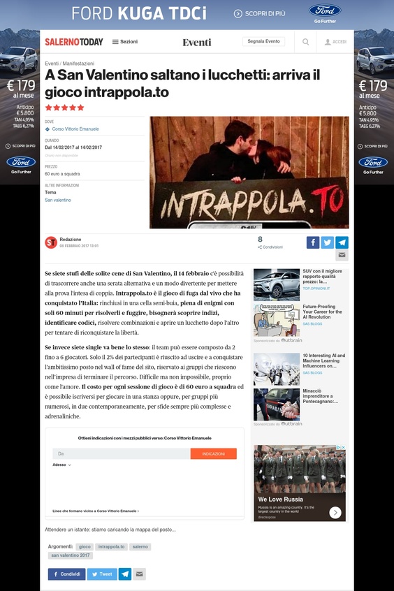 A San Valentino saltano i lucchetti: arriva il gioco intrappola.to Eventi a Salerno „ Se siete stufi delle solite cene di San Valentino, il 14 febbraio c'è possibilità di trascorrere anche una serata alternativa e un modo divertente per mettere alla prova l'intesa di coppia. Intrappola.to è il gioco di fuga dal vivo che ha conquistato l’Italia: rinchiusi in una cella semi-buia, piena di enigmi con soli 60 minuti per risolverli e fuggire, bisognerà scoprire indizi, identificare codici, risolvere combinazioni e aprire un lucchetto dopo l’altro per tentare di riconquistare la libertà. Se invece siete single va bene lo stesso: il team può essere composto da 2 fino a 6 giocatori. Solo il 2% dei partecipanti è riuscito ad uscire e a conquistare l’ambitissimo posto nel wall of fame del sito, riservato ai gruppi che riescono nell’impresa di terminare il percorso. Difficile ma non impossibile, proprio come l'amore. Il costo per ogni sessione di gioco è di 60 euro a squadra ed è possibile iscriversi per giocare in una stanza oppure, per gruppi più numerosi, in due contemporaneamente, per sfide sempre più complesse e adrenaliniche.